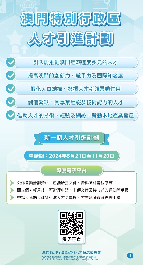 人才發展委員會訊:為推動澳門“1+4”經濟適度多元發展,提高澳門的創新力、競爭力及國際知名度,進一步帶動本地產業發展和社會長遠進步,特區政府推出新一期人才引進計劃,於2024年5月21日至11月20日期間接受三類人才,合共九個計劃的申請,包括:高端人才計劃,以及分別與大健康產業、高新技術產業、現代金融產業、文化體育及其他產業相關的四個優秀人才計劃和四個高級專業人才計劃。