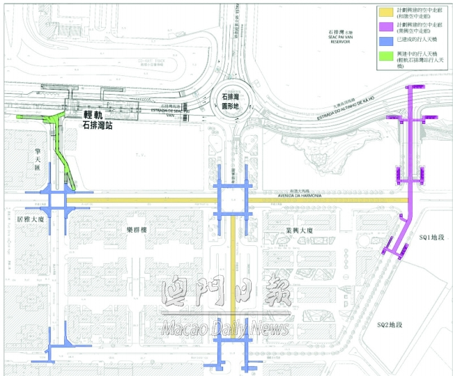 公建局表示,綜合考慮石排灣現有和計劃興建的行人天橋服務範圍、區內街道規模及現有建築物情況等,計劃增建“和諧大馬路空中走廊”,分別在和諧廣場及和諧大馬路的中央位置加設空中走廊,並與現有行人天橋連接,為實現以步行方式通往區內東西向和南北向的通達創造條件。