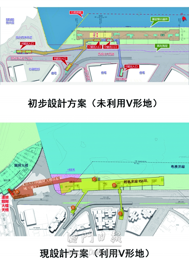 取得“V形地”使輕軌東線ES1站與關閘邊檢大樓具備條件無縫連接。公建局經與出入境部門和消防部門初步硏究連接方案,認為在現有邊檢大樓的出入口基礎上,可分別在一樓出境大堂及地面層入境大堂增加連接的方式,能直接疏導人流,提供通關和乘搭輕軌的便捷,實現客流全天候無縫對接。加強關閘口岸與輕軌交通接駁的便利,有助進一步理順關閘口岸周邊的通行環境。ES1站連通關閘邊檢大樓的方案仍處研究階段,將適時公佈。