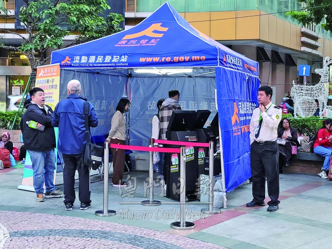 行政公職局今日繼續在三盞燈和氹仔花城公園側空地(近哥英布拉街)設置流動選民登記站,時間爲下午一時至六時。