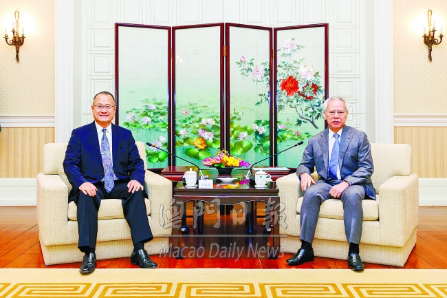 【本報消息】新聞局訊:行政長官岑浩輝前日會見第十四屆全國政協常委、粵港澳大灣區企業家聯盟主席蔡冠深一行,雙方就促進粵港澳大灣區及澳門特區經濟發展交流意見。
