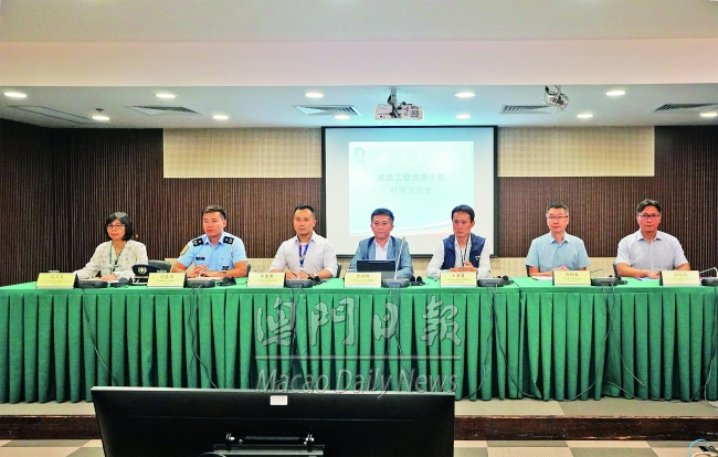 交通事務局交通管理廳長曾祥軒、協調處代處長麥豪傑,公共建設局基建工程處長王國慶,治安警察局交通廳警司何嘉傑,市政署道路處代處長容錦龍,土地工務局城市規劃廳高級技術員伍玉美,環境保護局能源業發展及管理廳高級技術員余培源昨出席道路工程協調小組新聞發佈會。